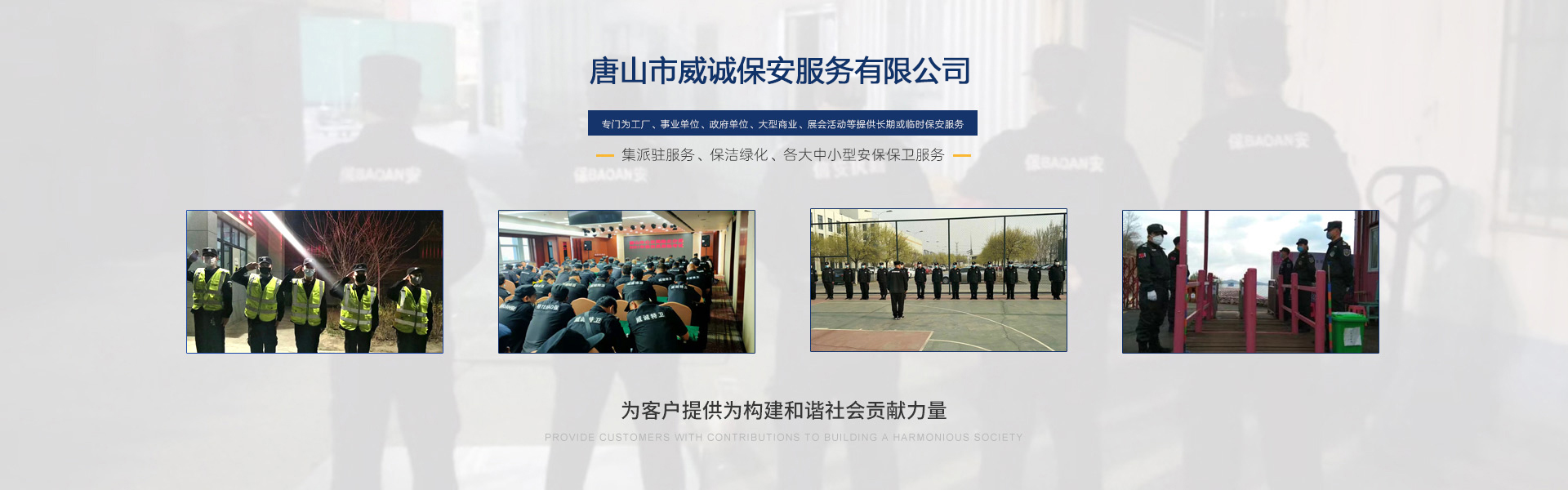 唐山市威誠保安服務有限公司自成立以來以“嚴防死守、忠于業主”為服務原則,以“客戶滿意、 合作共贏”為根本目標。以科學的管理、多方位多層次的服務,建立了首問責任制,完善了走訪、回訪 、滿意度調查、末位淘汰的預警管理,不斷提高服務質量,提高業主滿意度,提高企業形象。秉承“誠 實守信,紀律嚴明,團結協作,致精致誠”的服務理念,為客戶提供高品質、多方位、專業化的保安服務。 本公司制定了嚴謹的定向招生、崗前培訓、考核錄用、崗中培訓、持續培訓、末位淘汰制等一整套完善的管理體系。可以根據客戶的要求實地勘察評估,以量身定做的方式提供安保防范服務。